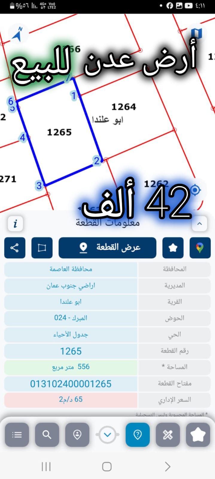 قطعة رقم 1265  بمساحة 556 متر بسعر 42 الف
