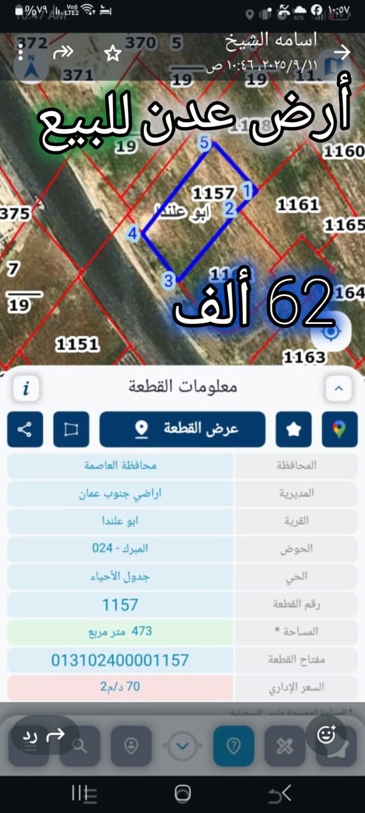 قطعة رقم 1157 بمساحة 473 متر بسعر 62 الف