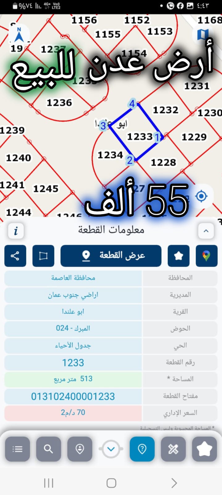 قطعة رقم  1233 بمساحة 513 متر بسعر 55 الف