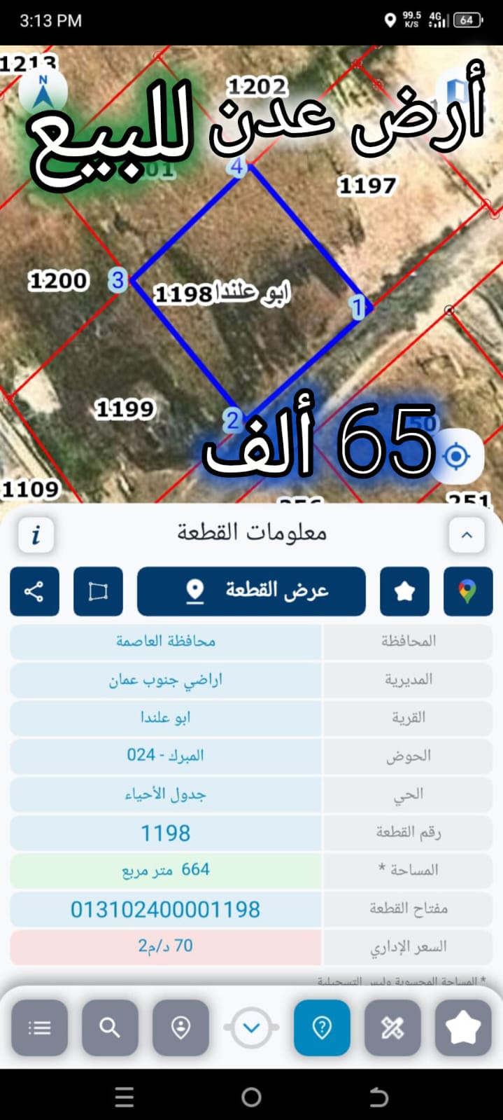 قطعة رقم 1198 بمساحة  664 متر بسعر 65 الف